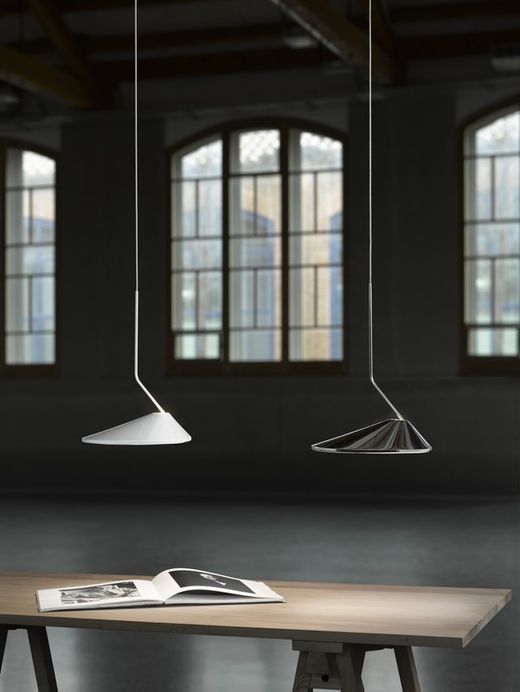 De conische lampenkap is gemaakt van hoogwaardig aluminium, verkrijgbaar in elektrolytisch bad of gelakte verfafwerkingen, die een verfijnde en duurzame uitstraling bieden. De schuine gietijzeren voet voegt een robuust tintje toe dat harmonieus contrasteert met de delicatesse van het display, waardoor een perfecte balans ontstaat tussen ruw en subtiel.
